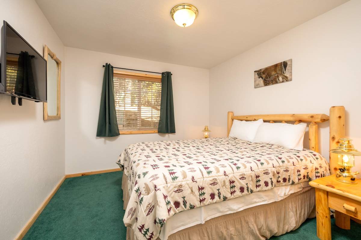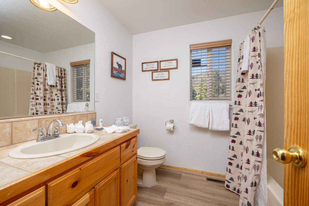 Charming log-style cabin nestled in the pines with beautiful mountain views in the serene Whispering Forest neighborhood. Light & bright interior with beamed ceilings, wood T&G, log accents, and wood laminate flooring. Open great room style main level with a cozy river rock fireplace and wainscoting. Kitchen has custom cabinetry, recessed lighting, and adjacent and dining area. Half bath on the main level. Lower level has 3 bedrooms and 2 baths, including a master suite with access to a private lower deck. Central forced air heat, A/C, separate laundry room. Fenced yard. Easy all-season access level entry and parking in the attached garage and sunny driveway. Enjoy peace and quiet off the beaten path with few passers-by, yet just minutes to town, ski slopes, and the lake.