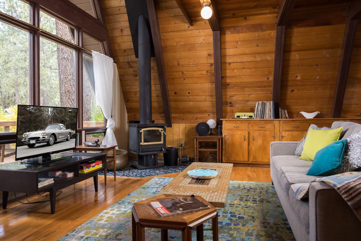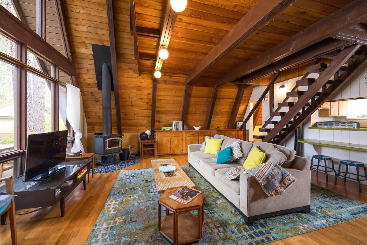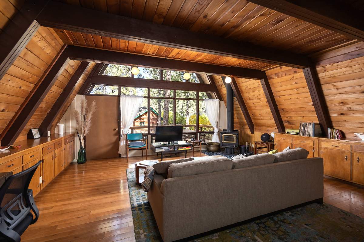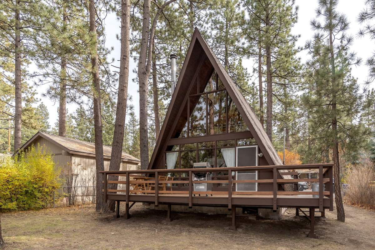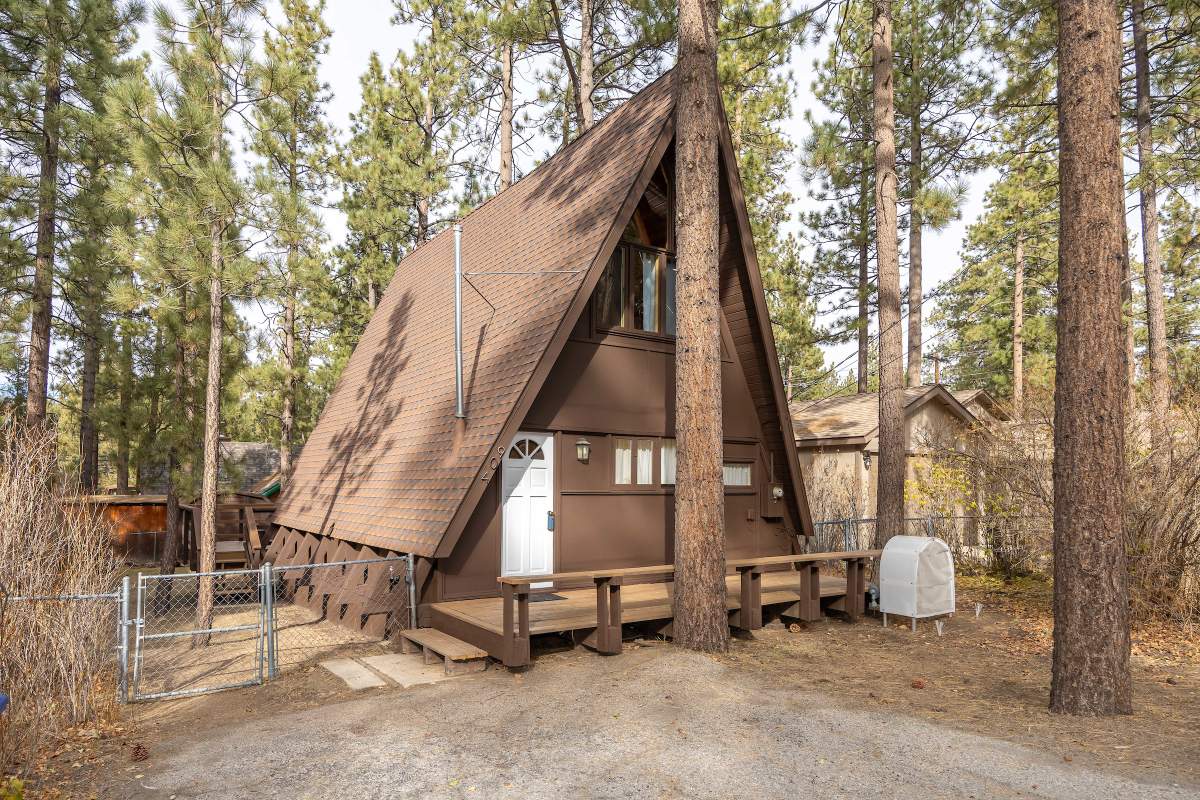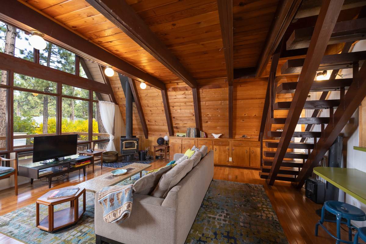 This classic A-frame cabin has a simply irresistible vintage vibe. Available for the first time on the market, built by the owner’s father in 1962 and loved by the same family ever since. As soon as you walk in the door you are greeted by a warm woodsy mountain cabin feel that so many are looking for. Beamed ceilings, abundant T&G, beautiful wood floors throughout. A wall of windows brings the outside in with views of the surrounding pines. Cozy up next to the free-standing wood burning stove after a day on the slopes. Bathroom on main level, two bedrooms up, one is open loft style. Enjoy the fresh mountain air and your morning coffee or evening martini out on the spacious back deck and front porch. Newly refinished exterior. Large fenced yard and storage shed. Easy four-season access and level parking. Groovy baby!