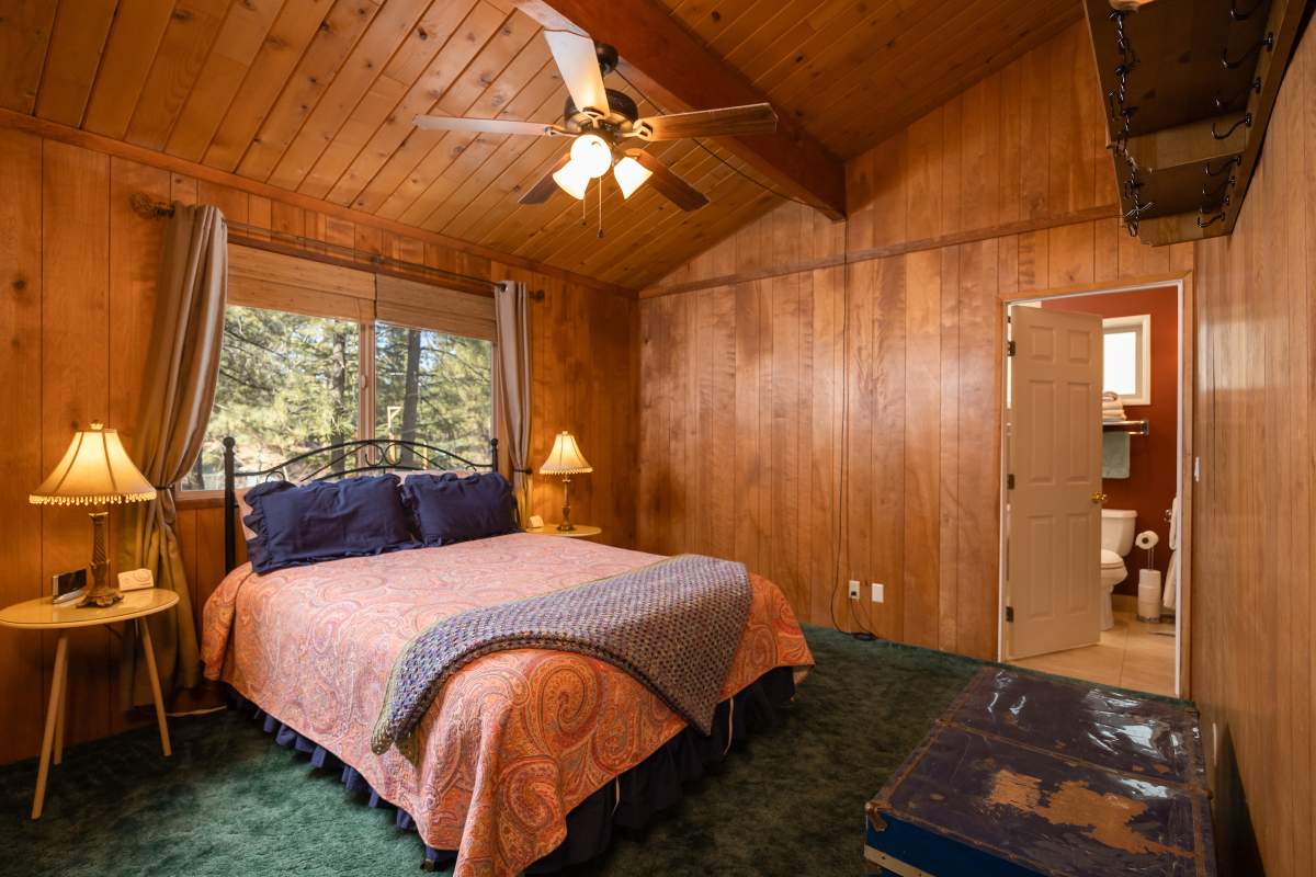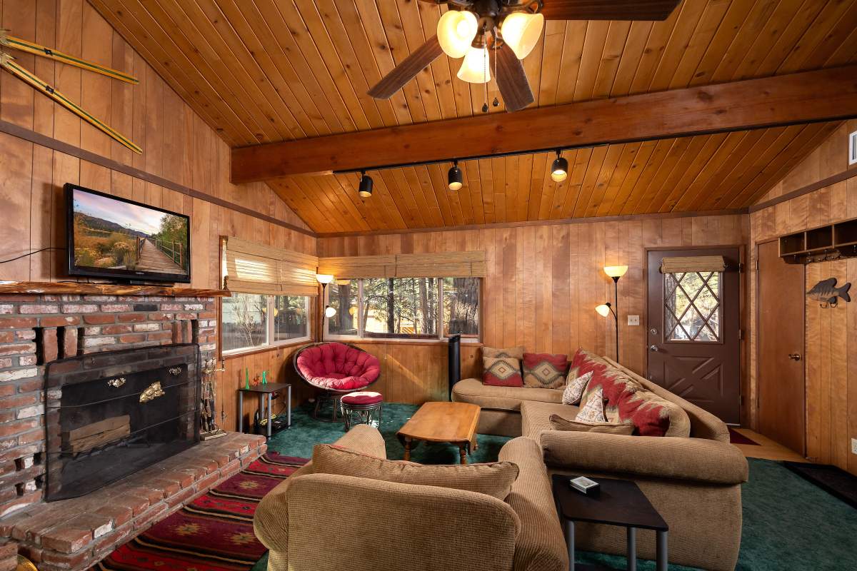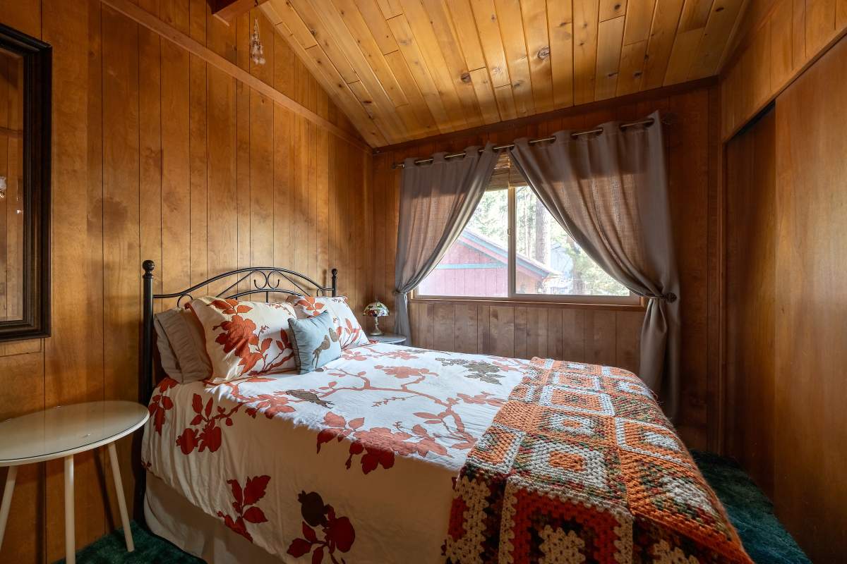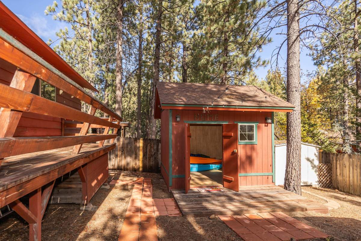 Charming classic sierra-style cabin perfectly located near the lake, ski slopes, shopping, and everything else Big Bear has to offer. Nestled amongst the pines on a fenced lot, this easy access single-level cabin is situated above the street affording a feeling of peace and privacy. Enjoy outdoor living out on the front porch and back deck with an additional covered sitting area in the inviting back yard. Large finished storage shed with electric presents multiple use options. Inside the cabin you are welcomed to an open floor plan with vaulted beamed ceilings throughout, and a cozy brick fireplace in the living room. The kitchen has a wood slab breakfast bar, plenty of cabinetry, laminate flooring, and adjacent dining area. Two bedrooms, two baths, one en suite with remodeled 3/4 bath and attached laundry room. Energy efficient items include central forced air heat, tankless water heater, and dual pane windows. This one won’t last!