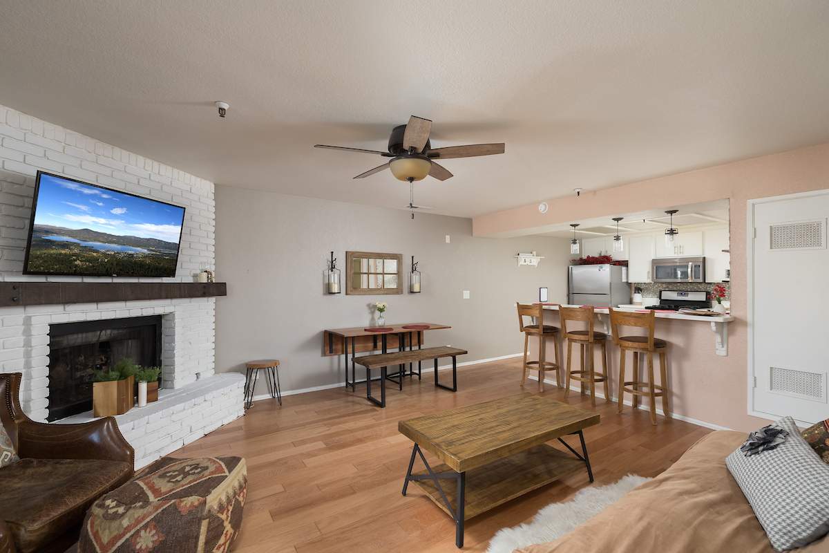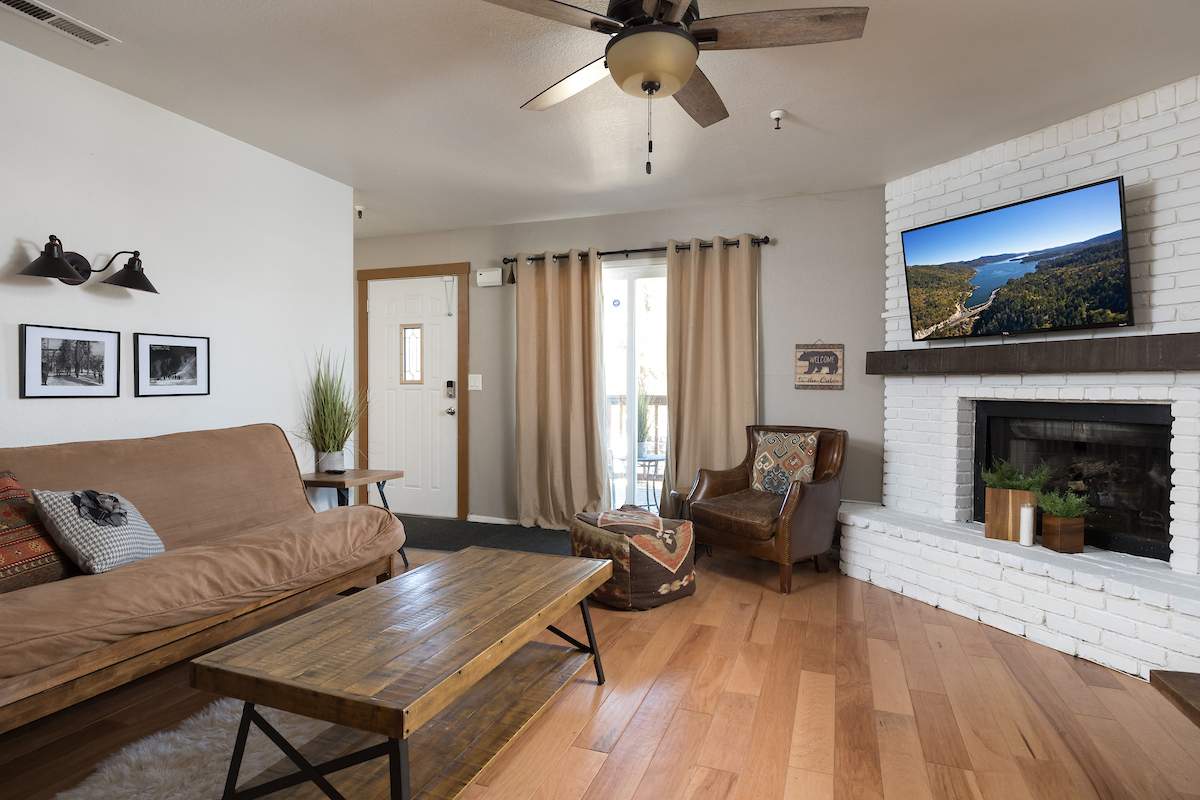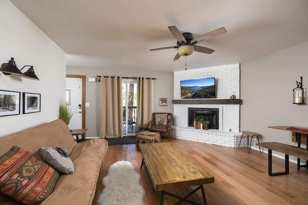 Located right down the street from Snow Summit, you can’t go wrong with this freshly updated condo. Light and bright interior with pleasing modern colors. Brick fireplace with efficient gas log insert. Attractive and durable wood laminate flooring. Remodeled kitchen w/stainless, breakfast bar with pendant lighting. Spacious main bedroom has accent wall and patio door for deck access. Upper and lower decks, rare garage w/convenient alley access. Turnkey and ready for you to start making memories and/or vacation rental income today.