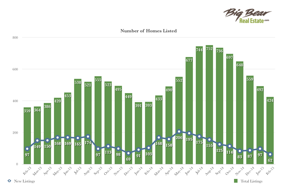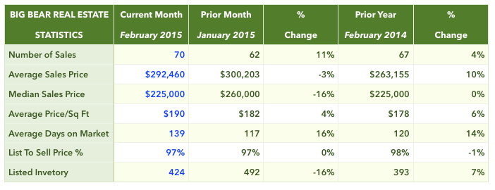 There is a continuing trend of rising property values in the Big Bear area, though we did see a slight dip in average and median sold prices from the prior month. The median sales price of single family homes in February decreased by 16% compared to the previous month and is even with where it was in February of last year. Average sales price is up 10% from February 2014. It was forecasted by the California Association of Realtors that property values across the state will continue to rise this year and next.