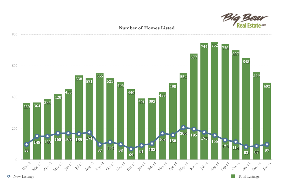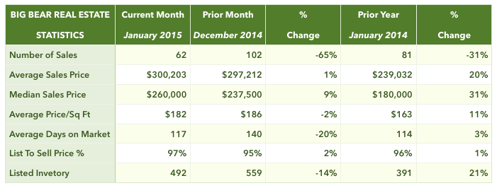 There is a continuing trend of rising property values in the Big Bear area. The median sales price of single family homes in January increased by 9% compared to the previous month and is 31% higher than it was in January of last year. Average sales price is up 20% from January 2014. Property values increased year over year in all four zip codes in Big Bear. It was forecasted by the California Association of Realtors that property values across the state will continue to rise this year and next.