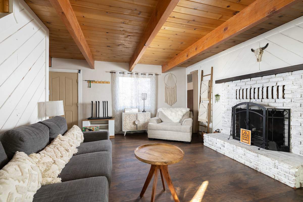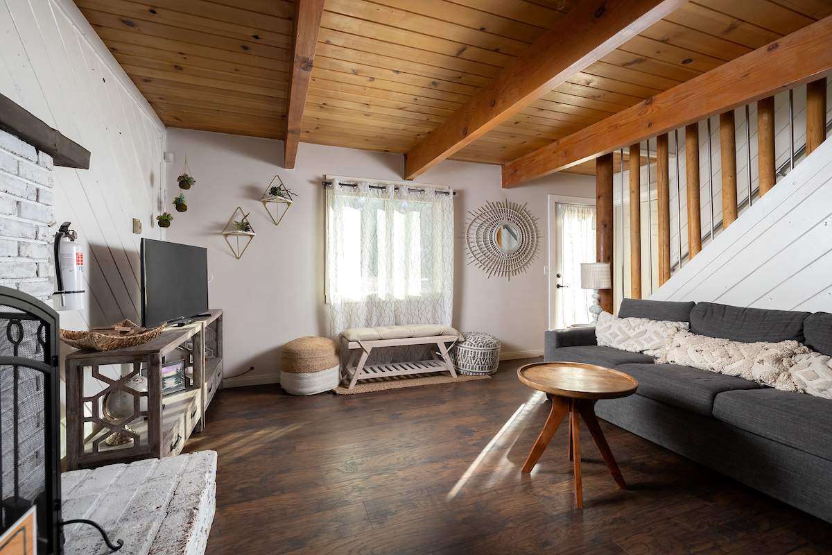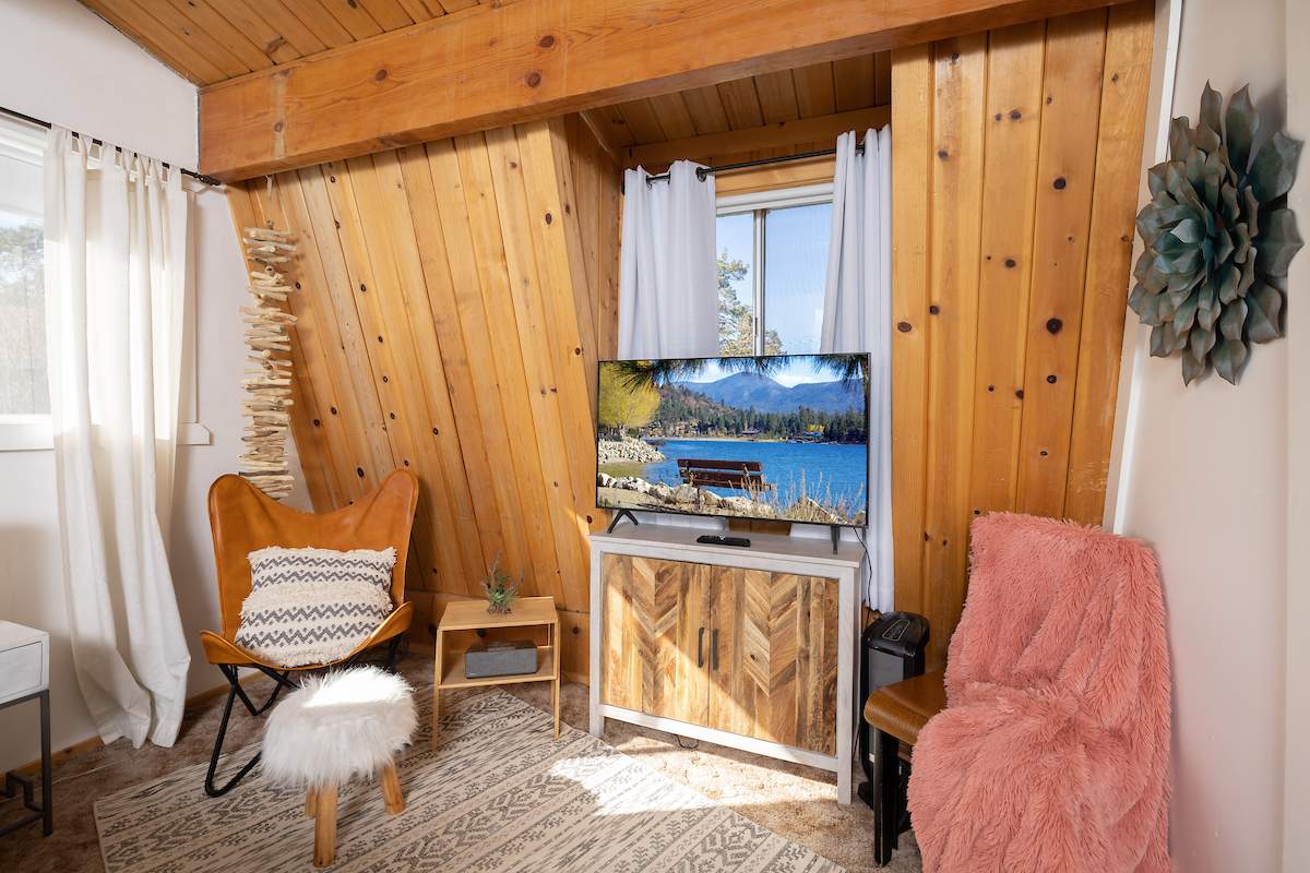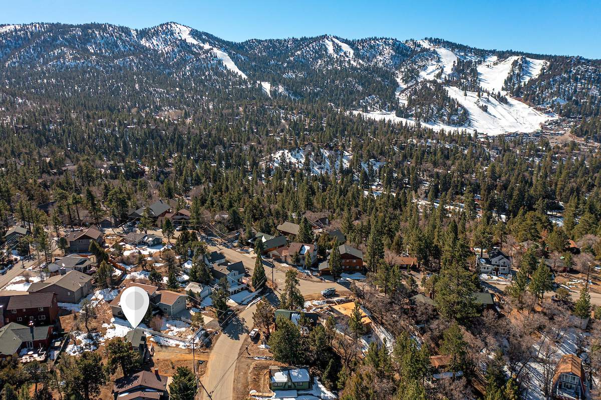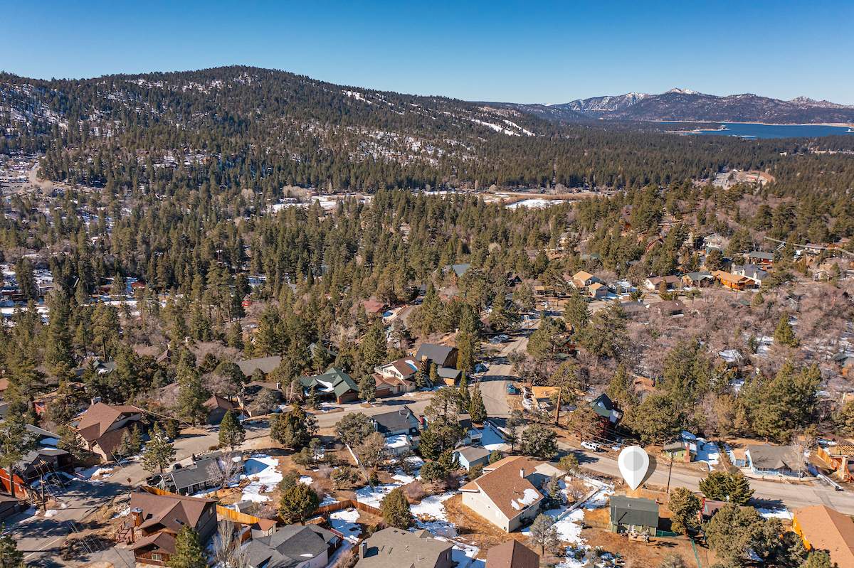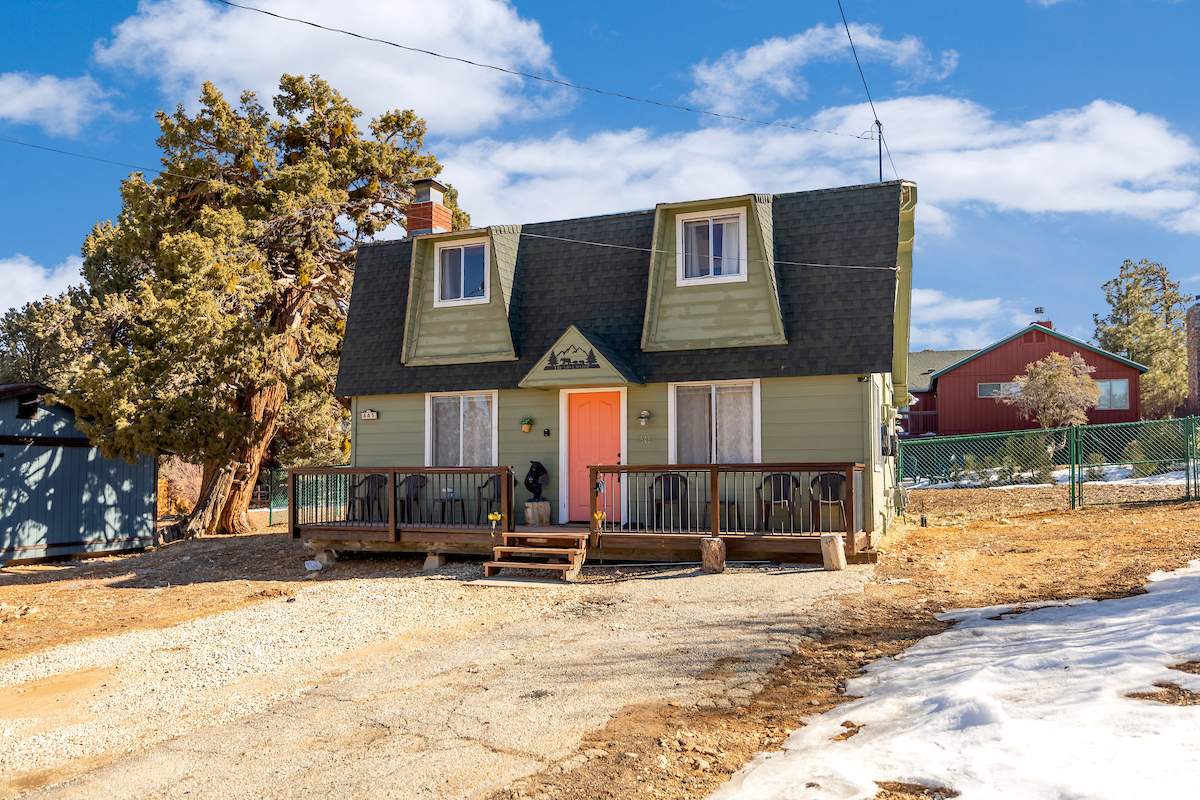 Tastefully updated gambrel-style cabin in upper Moonridge. Attractive wood laminate style flooring, brick fireplace, and beamed ceilings. Remodeled eat-in kitchen with stainless appliances and plenty of storage. Two spacious bedrooms with beamed ceilings and dormer windows. Remodeled bathroom features custom wood-look tile shower surround, wainscoting, and full size stacked laundry. High capacity tankless water heater. Gaze at the starry night sky from the spacious private fenced back yard. Easy year round access and plenty of parking and room to add a garage. High speed, high amperage electric car charger (40 amp 220V). Great location near ski slopes, forest, lake, and everything else Big Bear has to offer.