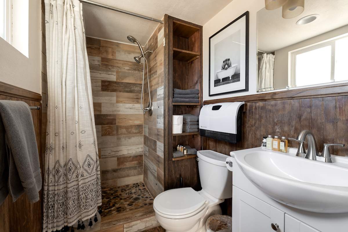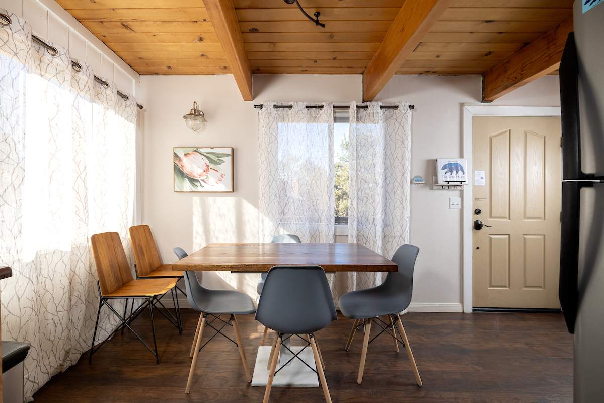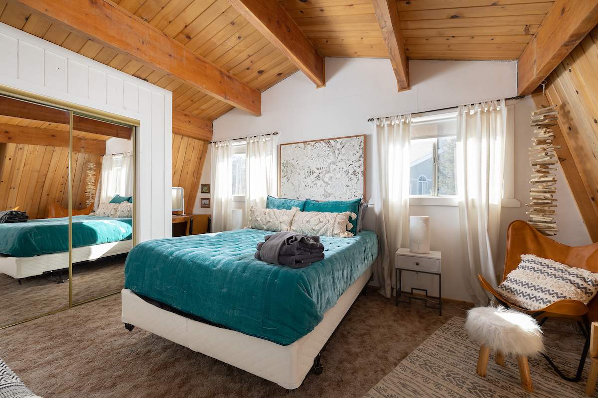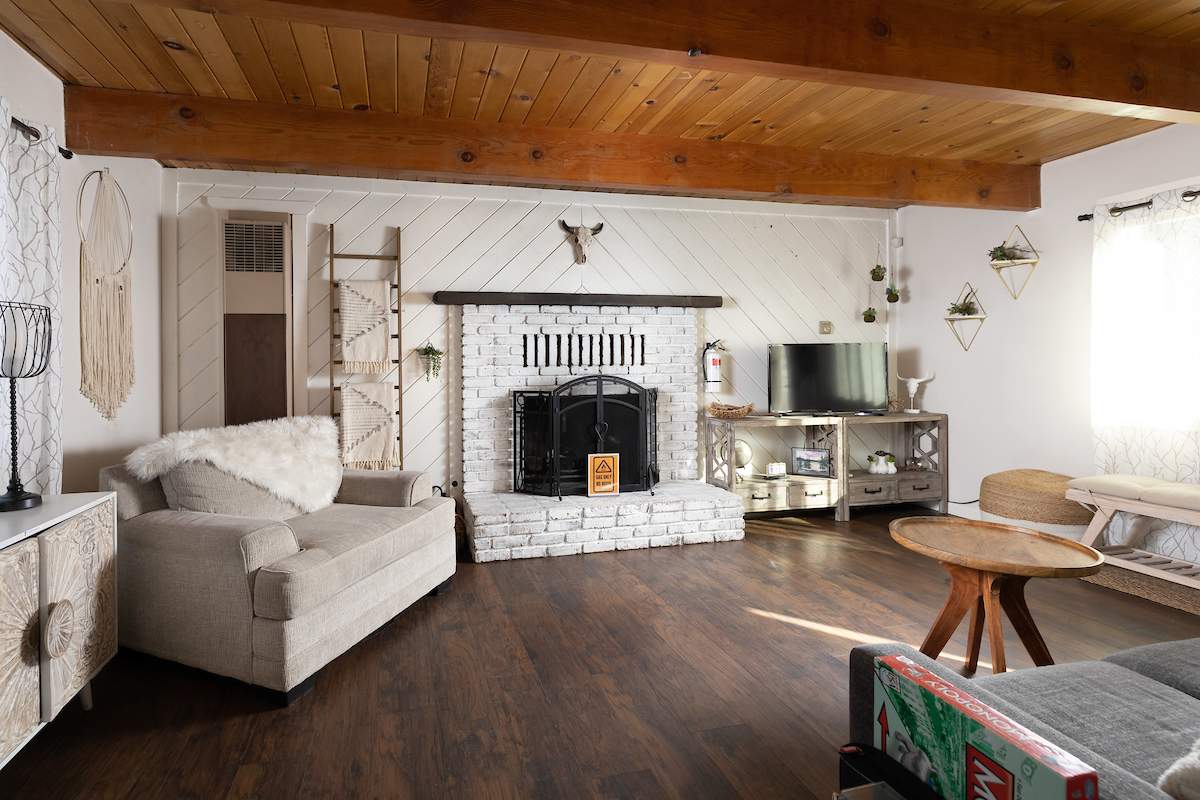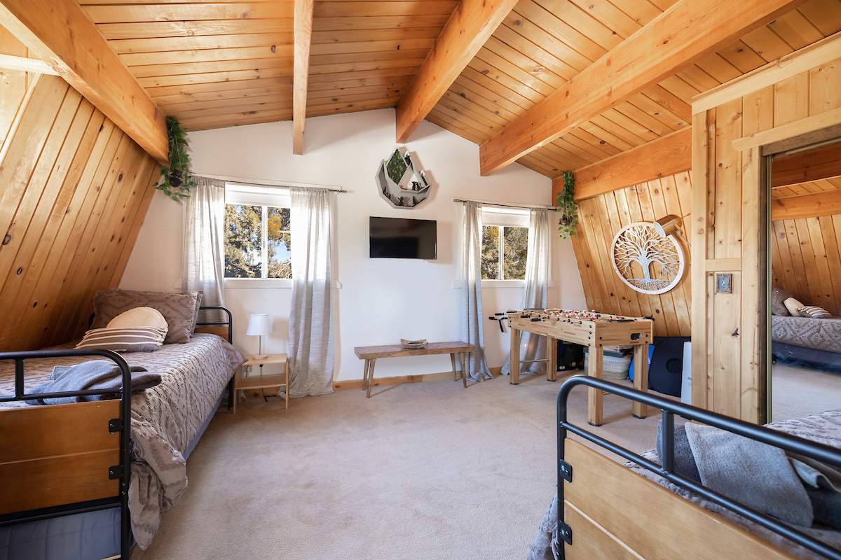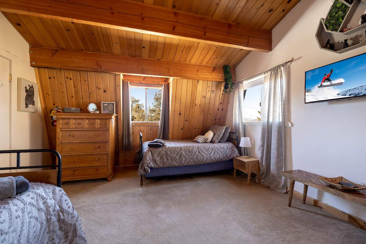 Tastefully updated gambrel-style cabin in upper Moonridge. Attractive wood laminate style flooring, brick fireplace, and beamed ceilings. Remodeled eat-in kitchen with stainless appliances and plenty of storage. Two spacious bedrooms with beamed ceilings and dormer windows. Remodeled bathroom features custom wood-look tile shower surround, wainscoting, and full size stacked laundry. High capacity tankless water heater. Gaze at the starry night sky from the spacious private fenced back yard. Easy year round access and plenty of parking and room to add a garage. High speed, high amperage electric car charger (40 amp 220V). Great location near ski slopes, forest, lake, and everything else Big Bear has to offer.