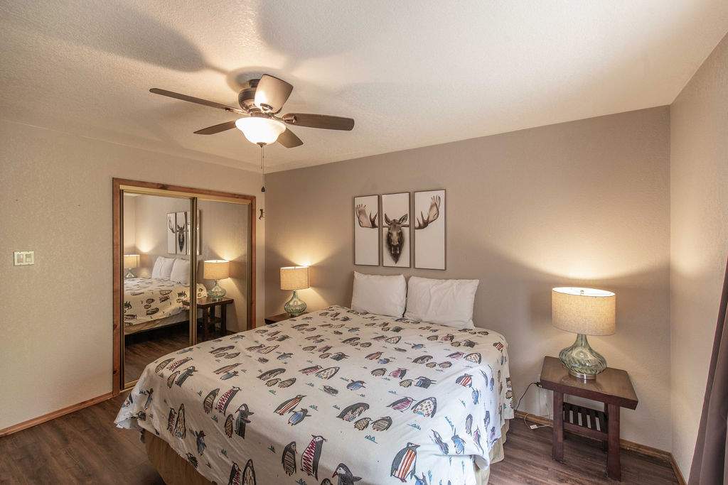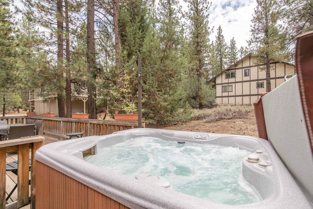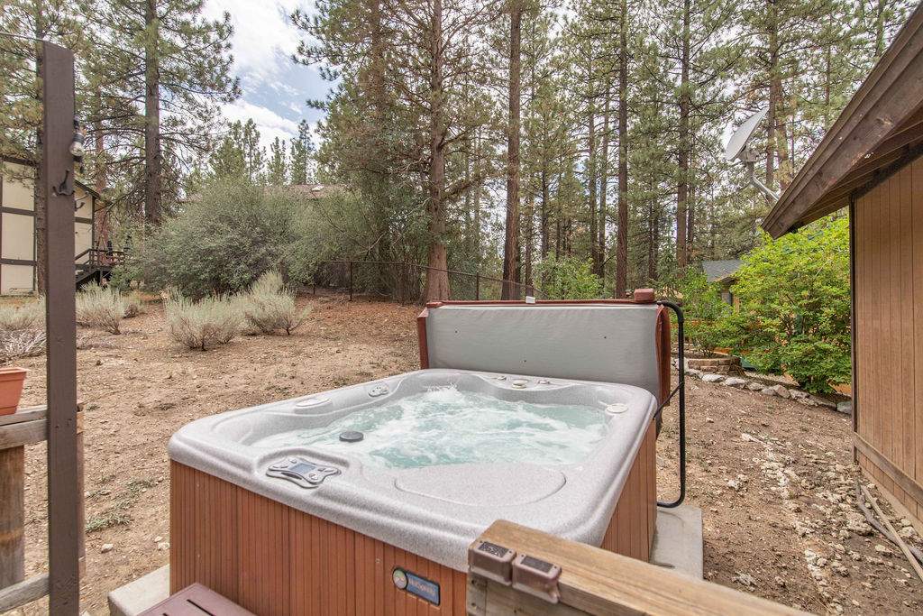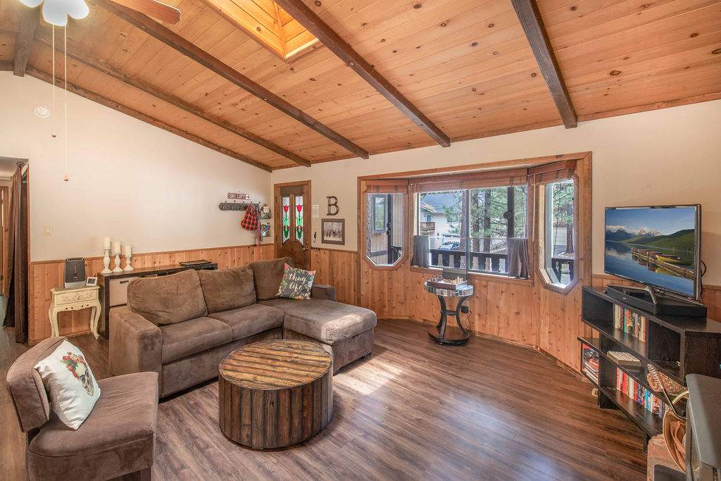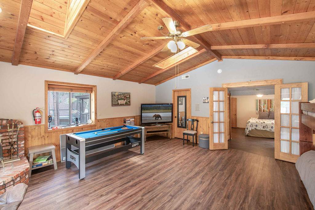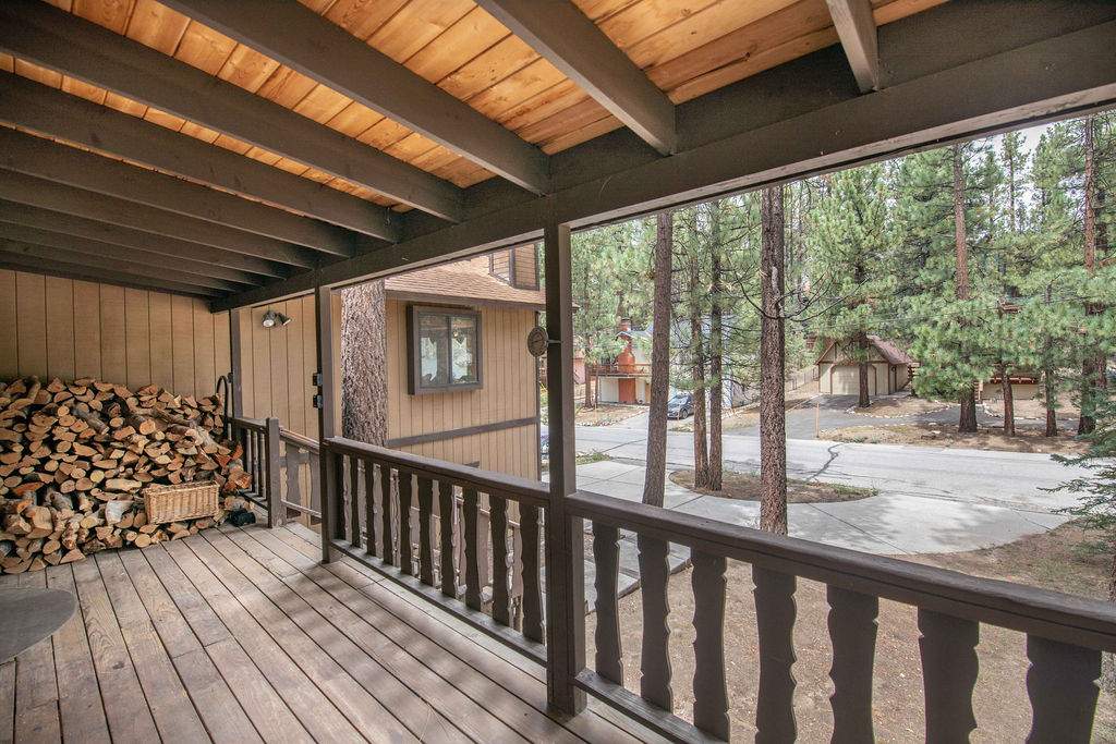 Fabulous Fox Farm location for this custom single-level home, just minutes to the ski slopes, lake, shopping and everything else Big Bear has to offer. Easy year-round access with attached 2-car garage and plenty of additional parking on the circular concrete driveway. Enjoy the fresh mountain air on the covered front porch & back deck; gaze at the stars while soaking in the spa. Great room boasts beamed T&G ceilings w/skylight, wainscoting, and an impressive brick fireplace with efficient wood stove. Remodeled kitchen has stainless appliances, recessed lighting and adjacent dining area. Other upgrades done in 2017 include all new flooring, new interior paint, and new vanities in the bathrooms. 3 bedrooms, one a pass-through to the third large bedroom, currently used as a game/family room + sleeping area, features beamed ceilings w/skylights and a Franklin stove. This home has all the makings of a fantastic weekend getaway, income-producing vacation rental, or full-time residence.