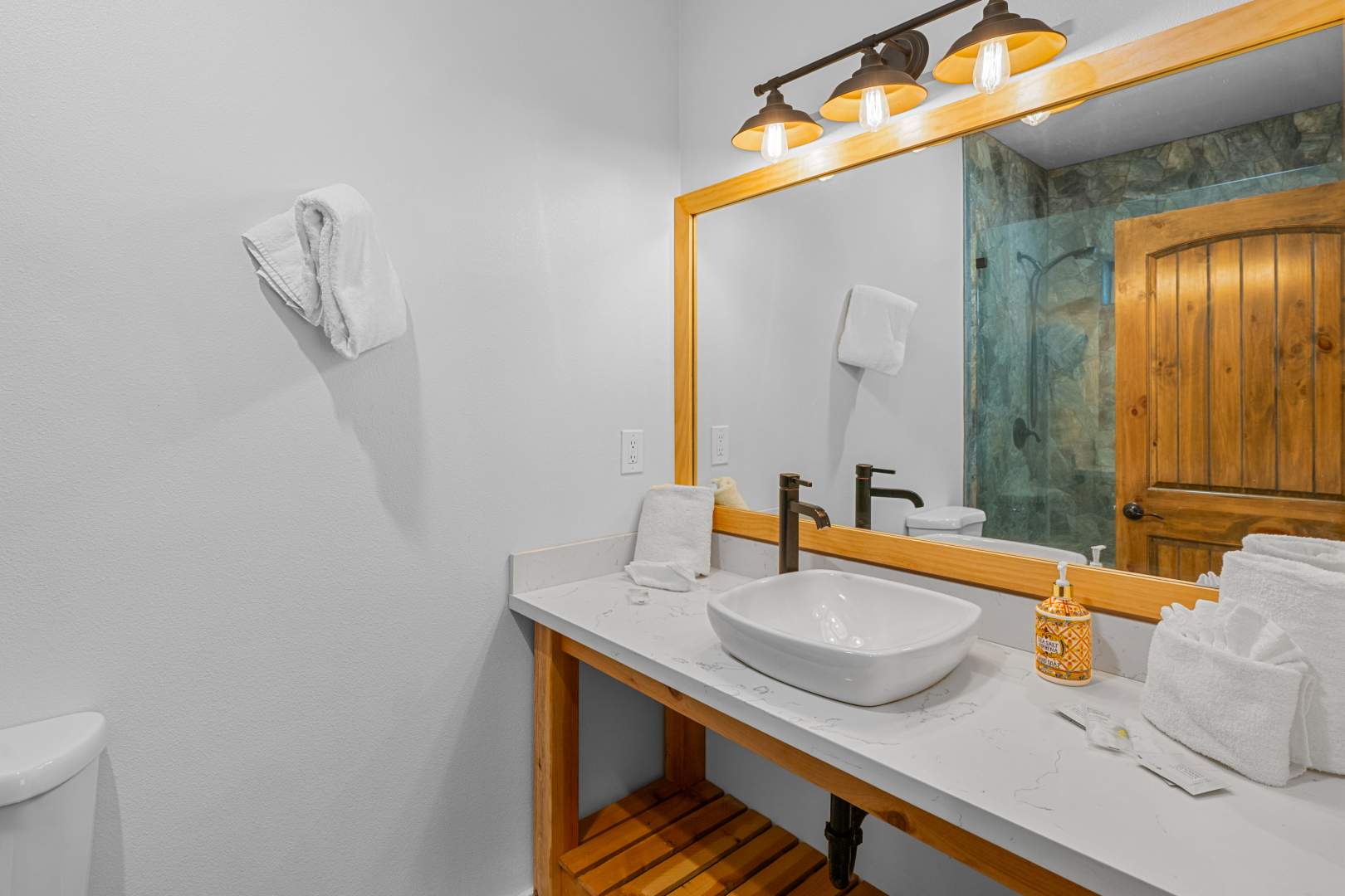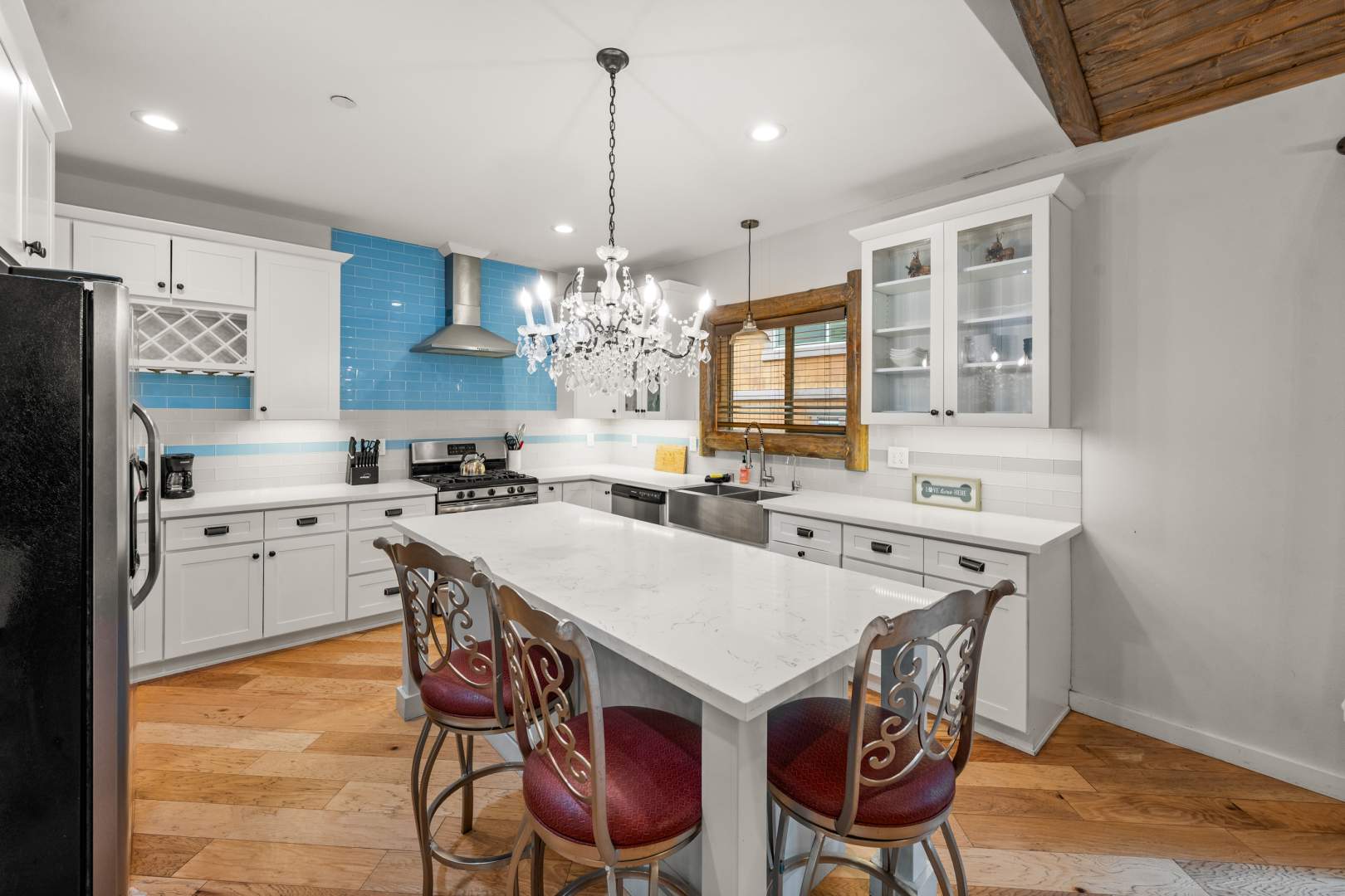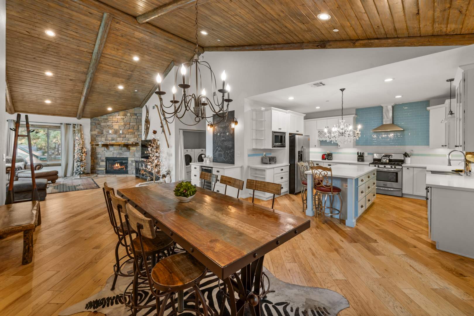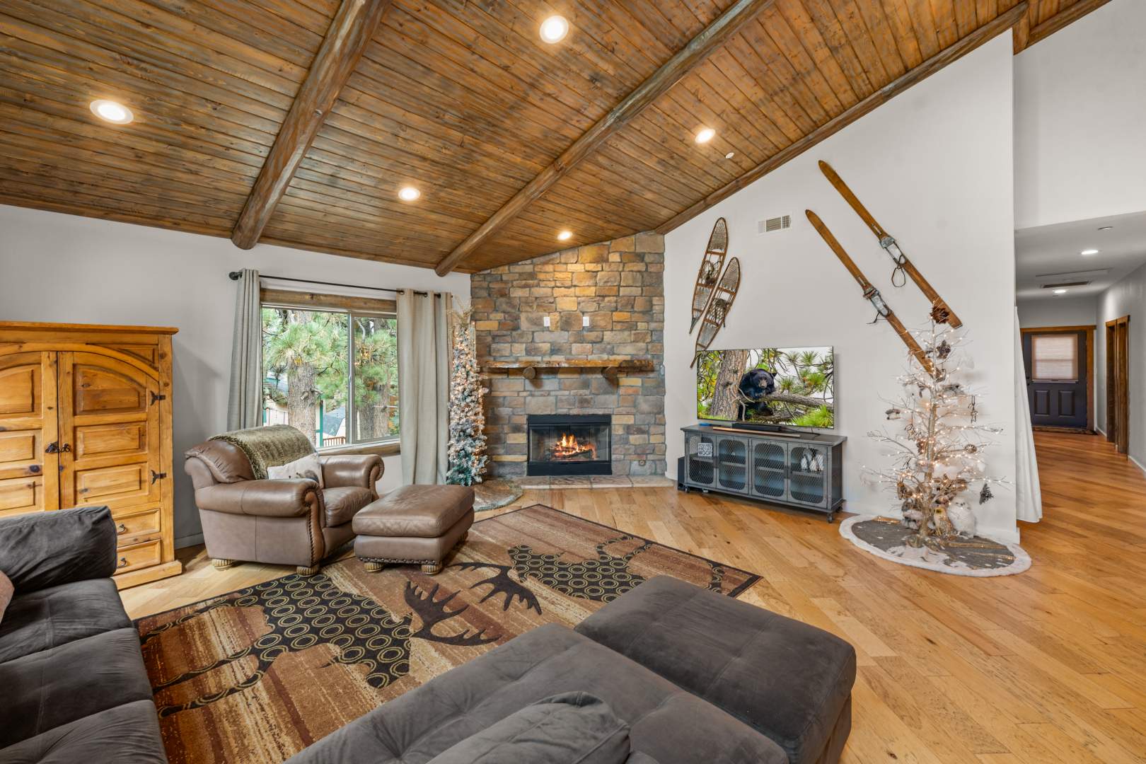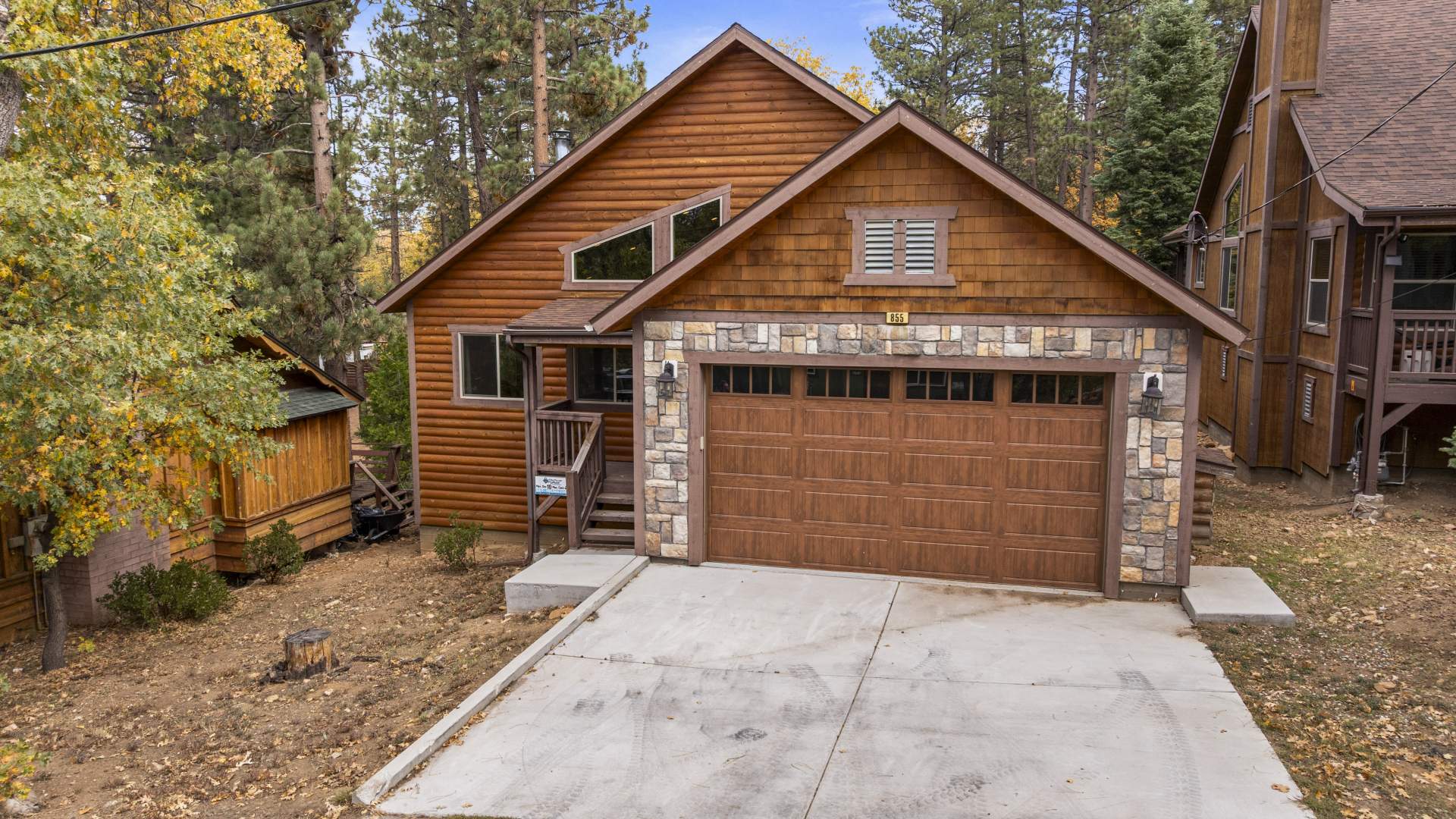 Welcome to your mountain retreat in the heart of Big Bear Lake! This newer (built in 2016) log-style chalet blends mountain rustic charm with modern comfort in an unbeatable central location—just minutes from forest trails, ski slopes, the lake, shopping, and dining, yet tucked away on a quiet dead-end street with no through traffic. The convenient single-level open floor plan features soaring vaulted ceilings and a spacious great room with a wood-burning stone fireplace—perfect for cozy winter evenings or gathering with friends after a day on the slopes. The beautifully appointed kitchen showcases marble countertops, subway tile backsplash, a large center island, and stainless appliances. High-end finishes and warm wood tones create an inviting mountain-modern atmosphere throughout. With 4 bedrooms and 3 full baths, this home offers ample space for family and guests. Two of the bedrooms open directly onto the expansive back deck, ideal for enjoying the serene forested surroundings and fresh mountain air. Additional highlights include an attached two-car garage, laundry, and easy all-season access with level entry. Whether you’re searching for a full-time residence, vacation getaway, or investment property with strong rental potential, this immaculate Big Bear chalet delivers comfort, convenience, and timeless mountain style in one exceptional package.