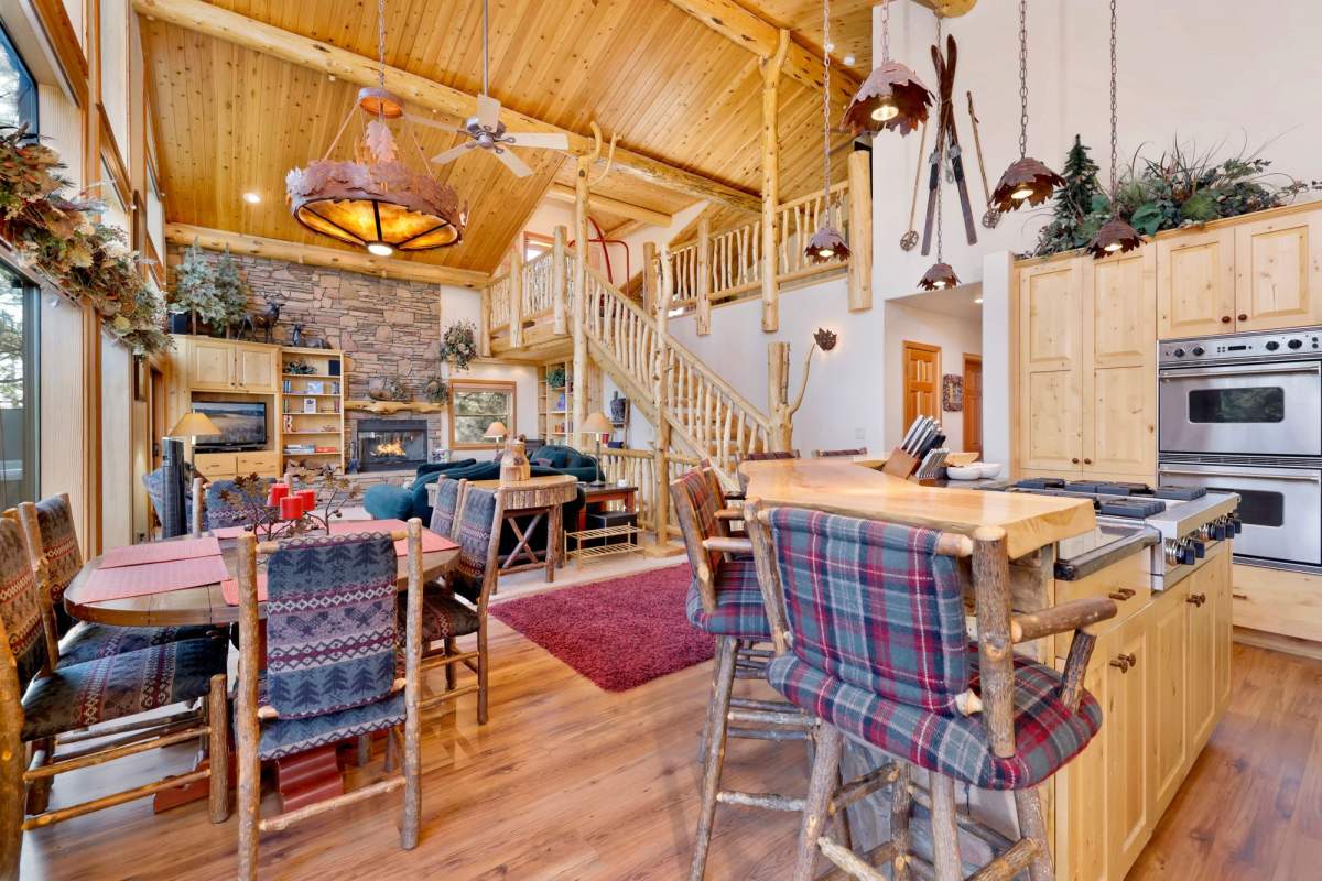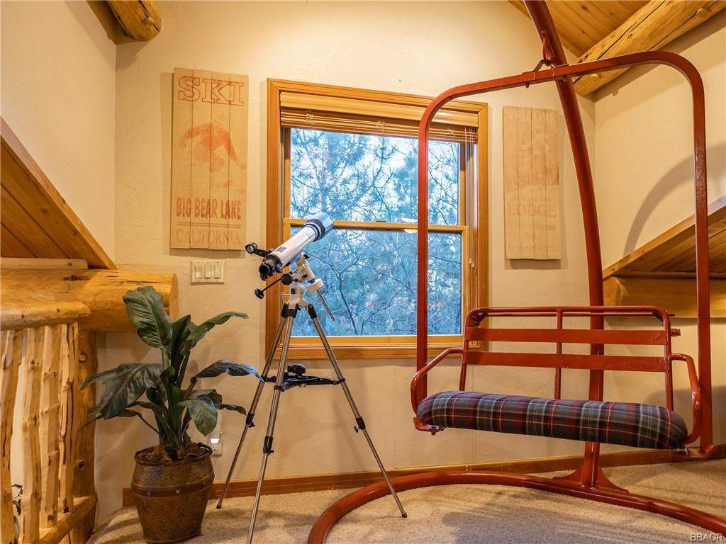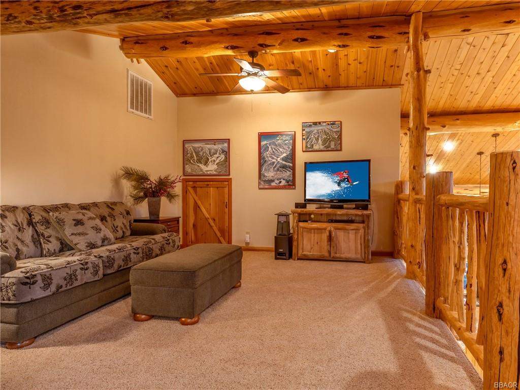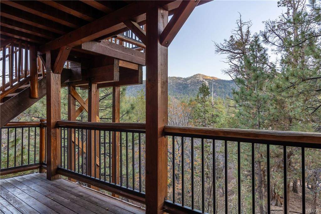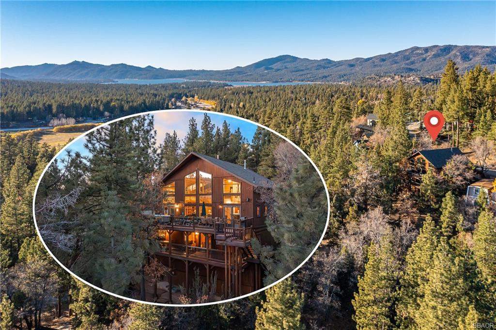 Check out this gorgeous custom log-style home with stunning panoramic views of the ski slopes. Situated in upper Moonridge offering a secluded tree-house feeling, though just minutes from the ski resorts, the lake, dining, and everything else Big Bear has to offer. The open great room floor plan features soaring beamed ceilings and an impressive wall of windows affording abundant natural light. Expertly equipped gourmet kitchen is outfitted with Viking cooktop range/griddle, double oven, and other high-end appliances. Wraparound island with wood slab and pendant lighting, granite countertops and beautiful custom cabinetry plus additional prep sink make entertaining a breeze. Enjoy outdoor living out on the multi level decks, take in views of Bear Mountain and the surrounding ridgeline. Soak in the spa under the stars after a long day on the slopes. Plenty of living space for the whole gang with 4 bedrooms, 3 baths, plus a loft and a bonus/game room. Master suite has access to lower level deck, walk-in closet, master bath has luxurious jetted tub, large glass surround shower, and dual vanities. Separate laundry room with tile counter tops and many cupboards. Property offers easy all-season access, level entry and parking with a street-level 2-car attached garage. This property has all the makings of a dream mountain getaway and/or successful vacation rental investment property.