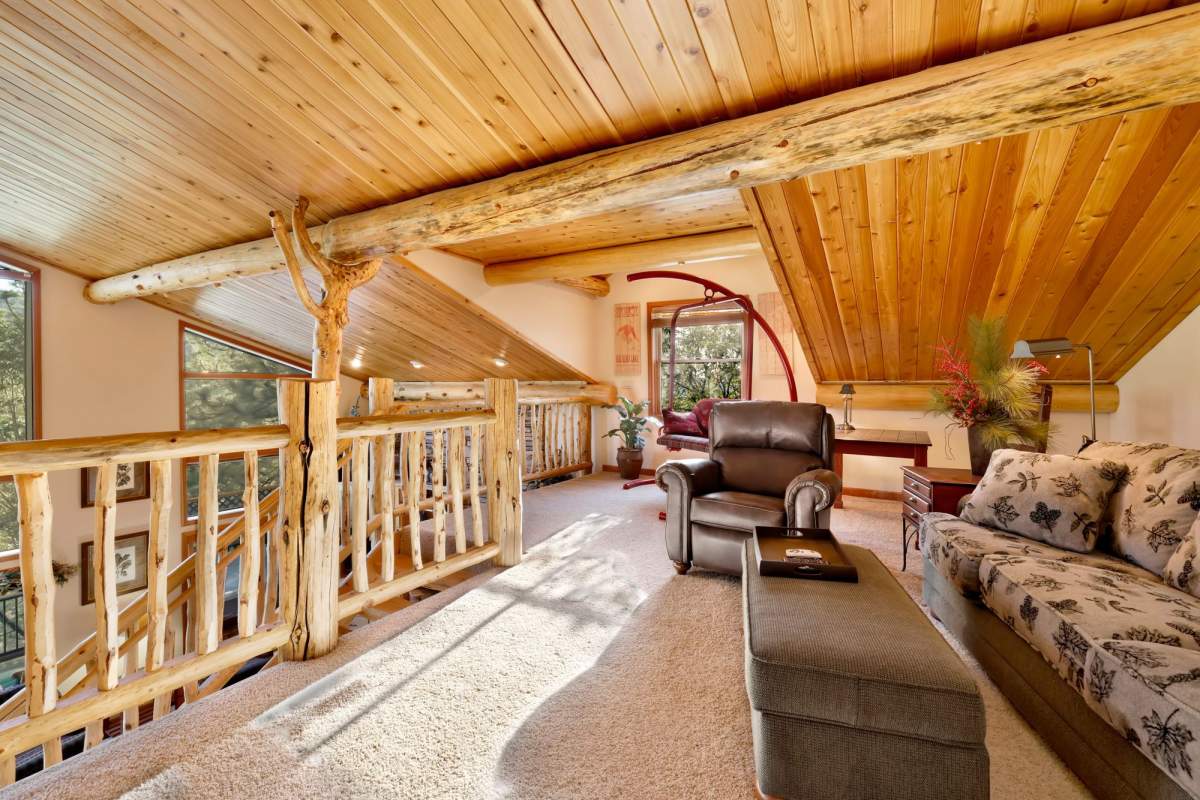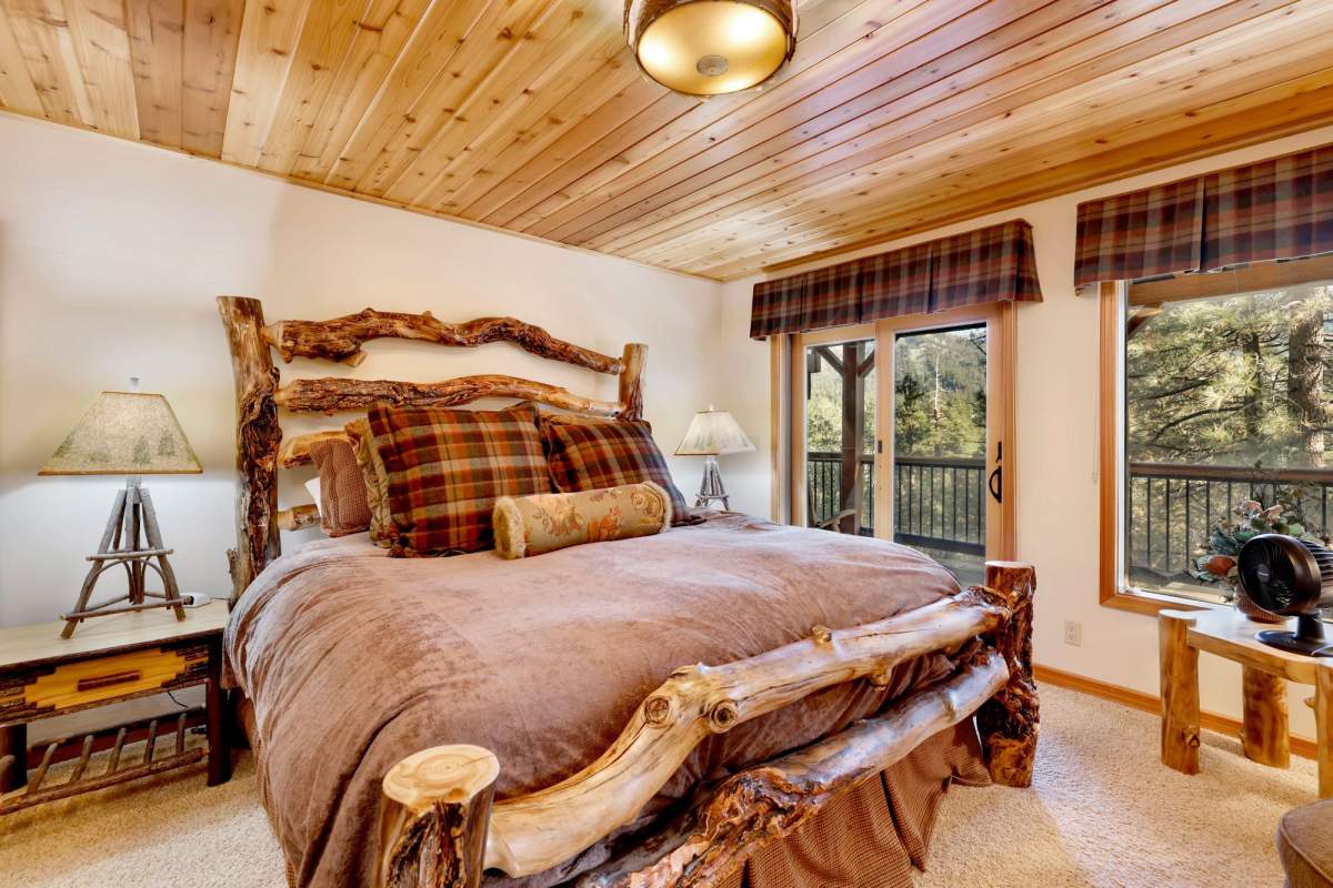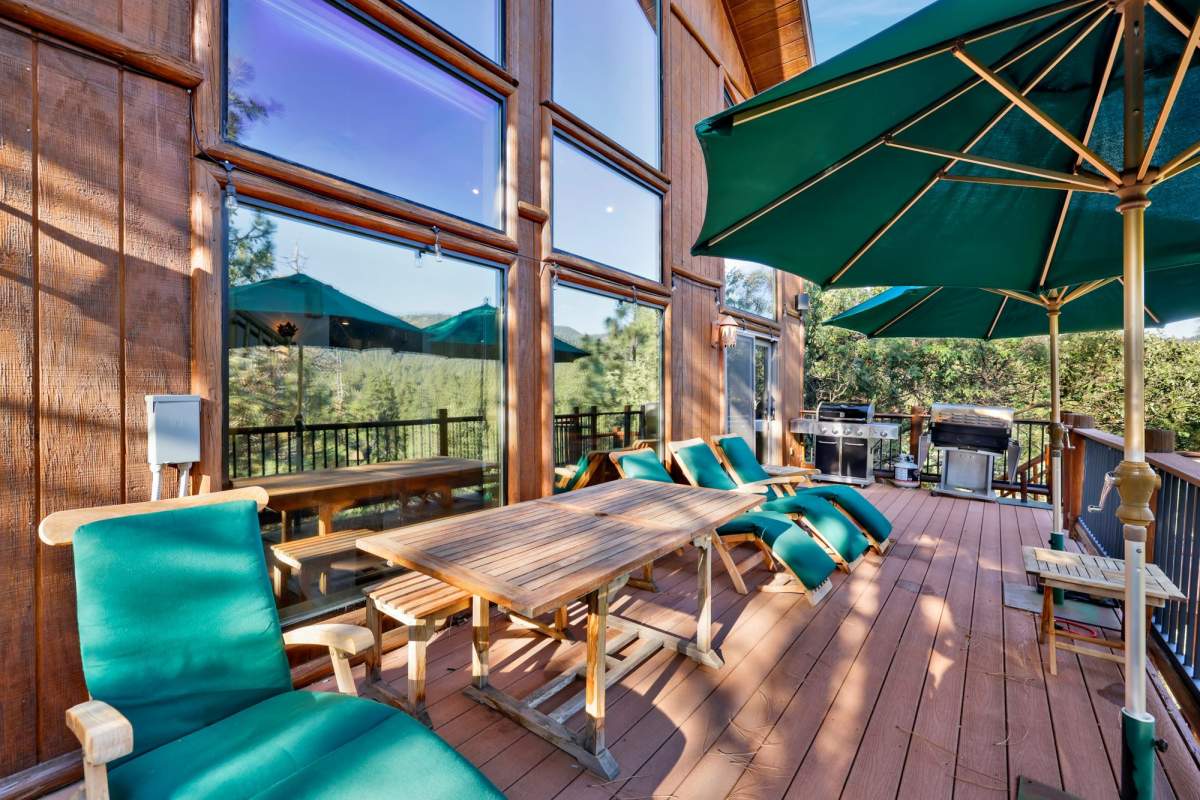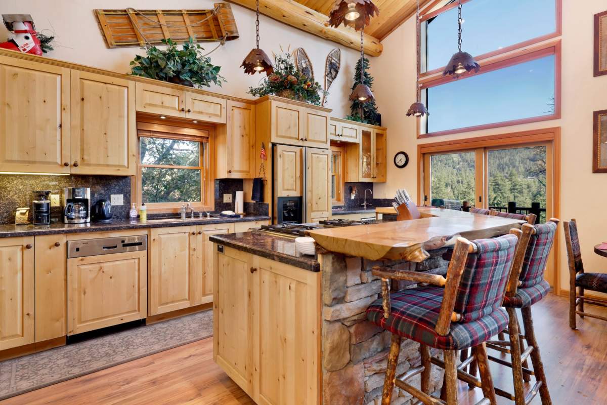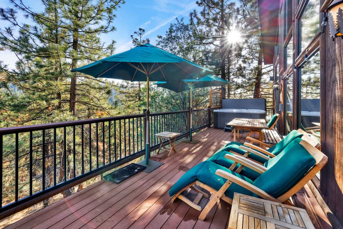 Check out this gorgeous custom log-style home with stunning panoramic views of the ski slopes. Situated in upper Moonridge offering a secluded tree-house feeling, though just minutes from the ski resorts, the lake, dining, and everything else Big Bear has to offer. The open great room floor plan features soaring beamed ceilings and an impressive wall of windows affording abundant natural light. Expertly equipped gourmet kitchen is outfitted with Viking cooktop range/griddle, double oven, and other high-end appliances. Wraparound island with wood slab and pendant lighting, granite countertops and beautiful custom cabinetry plus additional prep sink make entertaining a breeze. Enjoy outdoor living out on the multi level decks, take in views of Bear Mountain and the surrounding ridgeline. Soak in the spa under the stars after a long day on the slopes. Plenty of living space for the whole gang with 4 bedrooms, 3 baths, plus a loft and a bonus/game room. Master suite has access to lower level deck, walk-in closet, master bath has luxurious jetted tub, large glass surround shower, and dual vanities. Separate laundry room with tile counter tops and many cupboards. Property offers easy all-season access, level entry and parking with a street-level 2-car attached garage. This property has all the makings of a dream mountain getaway and/or successful vacation rental investment property.